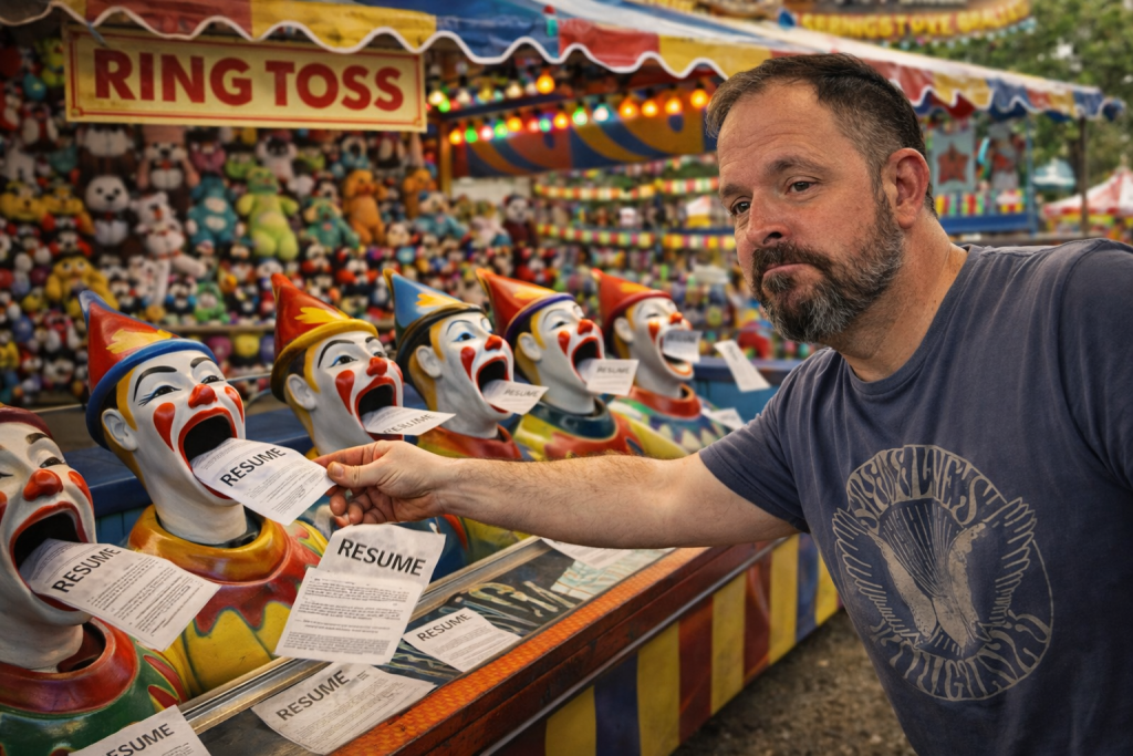 And then there is the circus. Ghosts who call you all excited, talk for an hour, and vanish like they entered witness protection. Companies that want a 55-minute personality test and a 25-minute work sample they are absolutely going to steal and use on Monday. (this happened) One of my interviews was with a flakey guy talking about a job stuck between two contractors, one who won the bid and one who was pissed they lost. I am somehow still in the running for that disaster. Somewhere along the line the entire hiring process turned into a carnival run by idiots, and I say that as a man who just compared his hit rate to a carnival ring toss.